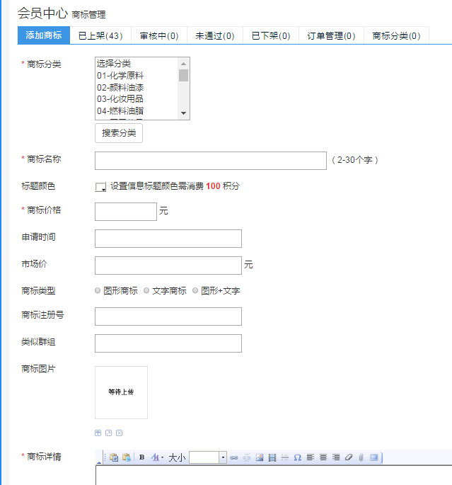 在此頁面可以根據(jù)自己實際情況,選擇要發(fā)布的商標(biāo)信息,包括:商標(biāo)類別、名稱、價格(包括出售價及市場價,市場價僅供買家參考)、申請時間、類型、注冊號、類似群組、圖片上傳以及簡要的文字說明,確認(rèn)無誤后即可點擊提交,待我們客服人員審核完畢后,即可在前臺出現(xiàn),成功上架。